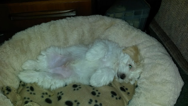 Taken the day we brought Dudley home, 27th September 2018 - making himself comfy. Enough to even lie on his back in his bed. He arrived with the little fleece, a toy monkey and a little yellow tennis ball to help him to settle in: