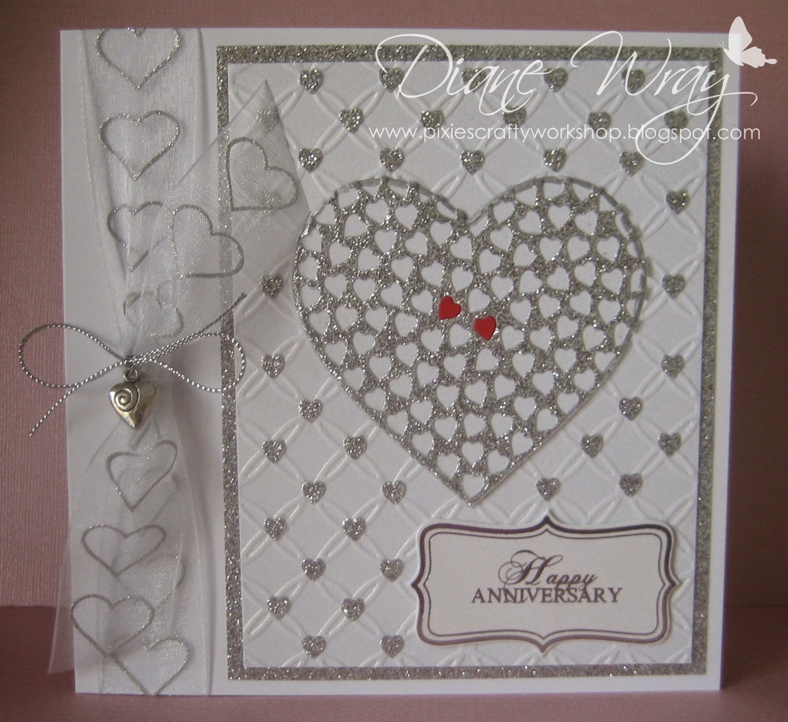 I used a plain square 6" x 6" white card, punched the right hand edge with MS punch, and added a strip of silver card behind the lacy holes. The silver embossed card was layered onto more silver card, the sentiment is a Craftwork cards one, turned over, stamped with 25, embossed in silver (thereby ruining my desk mat - thank goodness the desk is fine though!!) and then edged with silver Stickles. The silver Josy Rose heart shaped nail heads had to get in on the act of course :))
