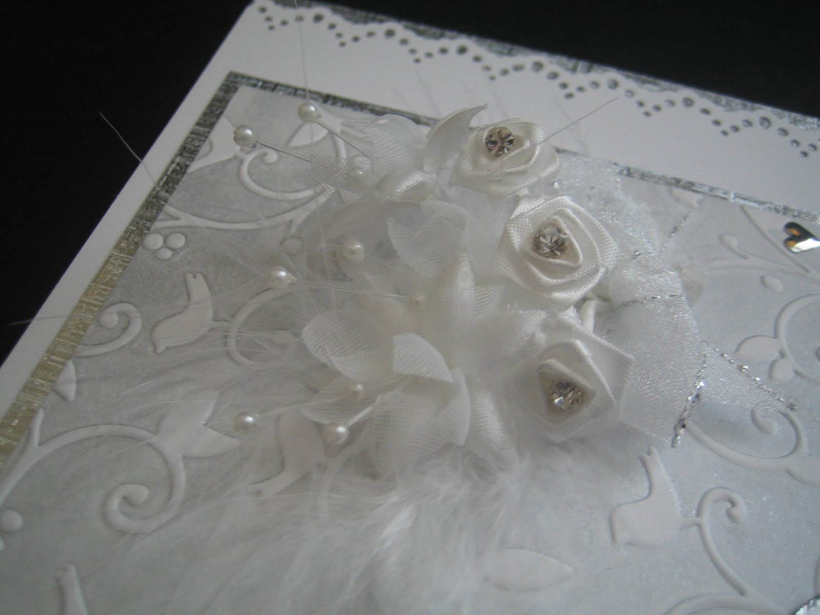 I didn't have a nice enough single white flower so I raided my old stash and made up a little posy - little ribbon roses with diamantes in the centre, silky lace flowers with pearl stamens, and a fluffy white feather tucked in behind - tied with silver edged white organza ribbon.
