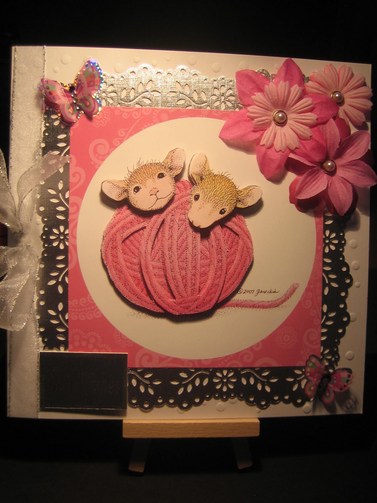 Shame the sentiment reflected the light - it's a silver Dufex one and just says 'Best Wishes', although the insert does say Happy 1st Anniversary!. The card is an 8" x 8" square white one with an embossed dots pattern. Then a silver layer of textured card, cut out round the edges using my only Martha Stewart Deep Edging Punch - no fancy 'Punch Around The Corner' ones as yet but I'm working on it! To hide the oddly matched corners I used a mix of the sentiment, 3-D butterflies ( these are lush!) and a selection of Prima flowers/pearl brads. Then my trademark organza bow down the left....and not forgetting the soooo cute House Mouse decoupage in the middle, which was the whole point of the card! As Julie and Steve are such a 'close knit' pair it seemed very appropriate! :)