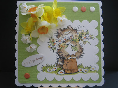 A scalloped square Nestie was used to die cut round the image, the sentiment is from Craftwork Cards and I added a few bits of orange/white Card Candy, also from them. I found the flowers tucked away in my stash - possibly among the first I ever bought as they are silk and were snipped from little branches of flowers bought from a local garden centre years ago......way before I discovered Prima and Wild Orchid flowers, and probably before using flowers on cards was so popular. The yellow daffodils were already just flower heads in a little box, from the same garden centre, and they came with droplets of 'dew' on - which was such a novelty back then. Hmm, was this me being ahead of the game for once in my life?!