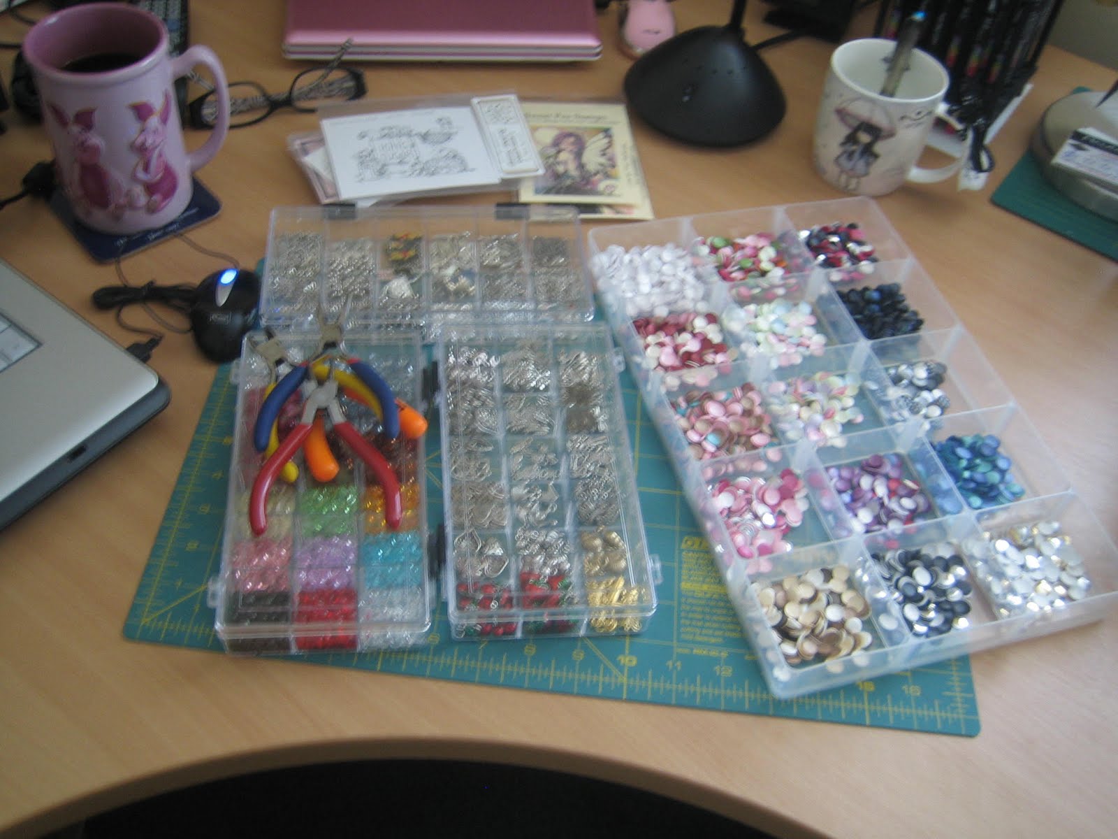 I'm trying to clear some stash away from the few cards I've managed to make recently, so my desk is pretty unexciting right now :(It isn't your eyes, this photo IS a bit blurred! I had my boxes of charms out whilst 'poodling' around yesterday making a card - plus some plain white card candi arrived in the post (brilliant to colour in with Pro Markers to match whatever colours have been used on images) so I've just added it to the RUB storage tray which seems to have a ton of candi in, even though I've given loads of it away since I first discovered it. Maybe it's breeding on the quiet?