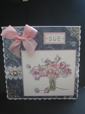 It's an 8" square scalloped card, topped off with some shimmery slightly patterned dark blue backing paper from my stash, lace also from my stash and a pink bow using the Ribbon Girls 32mm pure silk ribbon.. I added filigree corners and a few slightly pearlised pink gems, along with Sue's name. If you look closely at the lace there's a little teapot charm tied on with bakers twine :)).....oh, and of course I used the sweet peas watercolour! Almost forgot that bit! My OH chose the backing paper from my quite limited supply of large papers after disagreeing with my initial suggestion of silvery grey - he was the client after all :)) And of course, then it needed a box:
