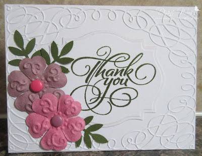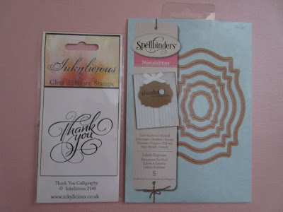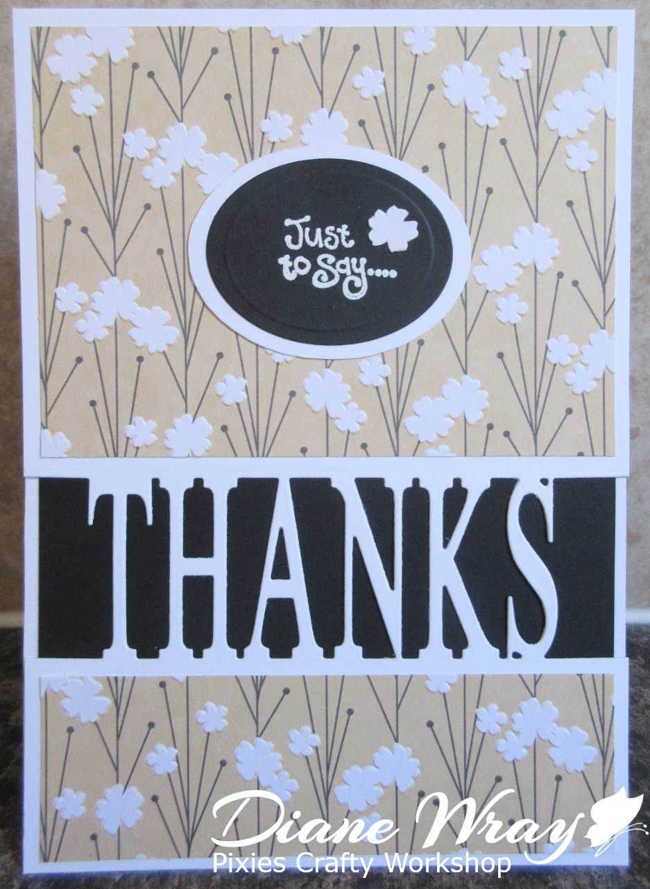 - so, I put the patterned paper die cut on top of the white card die cut, lined them up, held them in place on the cutting mat with low tack tape, put the Impression Obsession 'Thanks' die on top and ran them through the Cuttlebug - and that was why I'd used just 200gsm card, in case I was asking too much of the Cuttlebug in terms of thickness