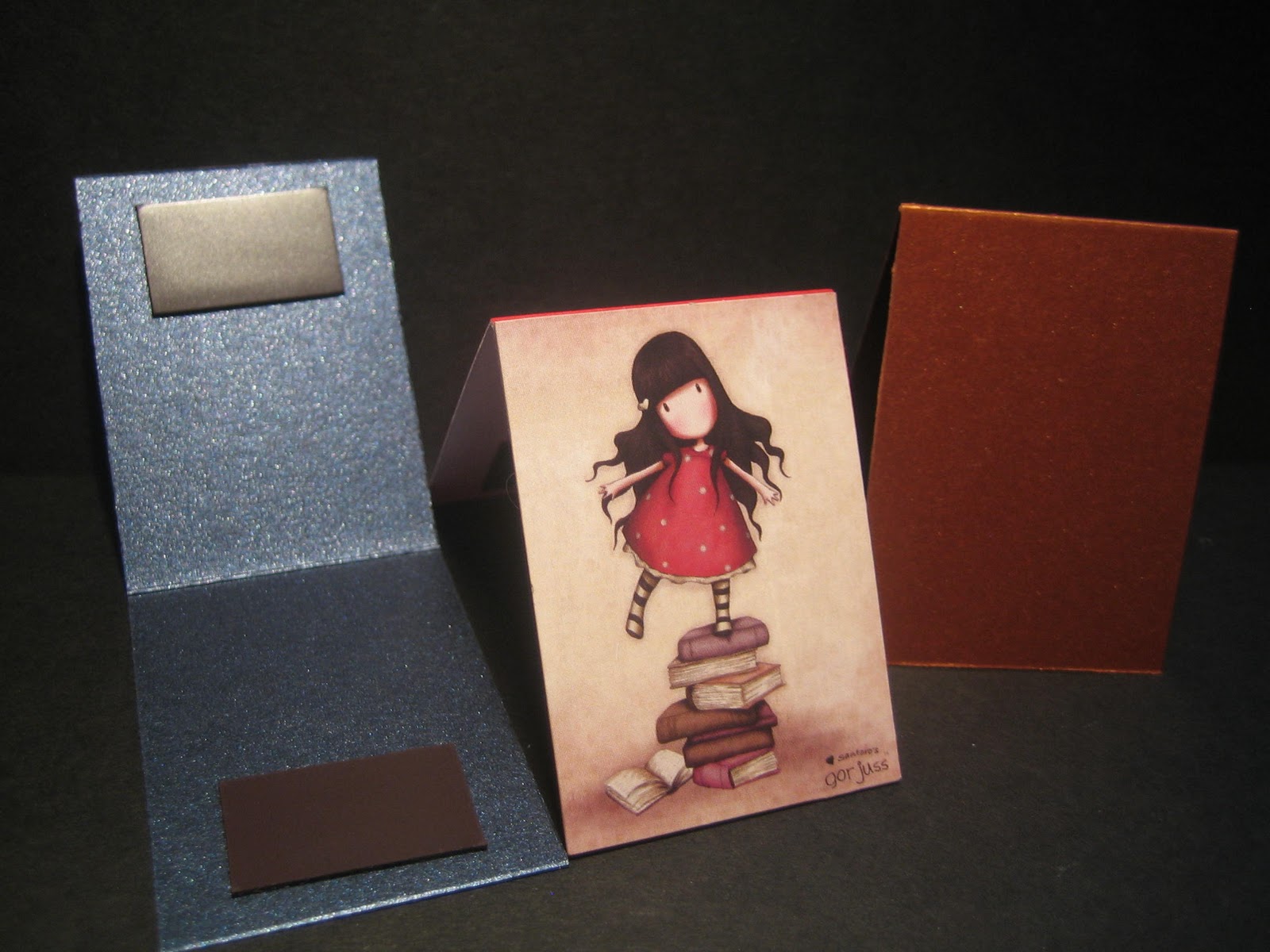 - then the magnets were applied. They come in pairs from Abel Magnets here, look for 'self-adhesive magnetic pairs' part way down the page in the link, and the best way is to remove the sticky backing from one of the pair and place it on inside of the front where you want it on the bookmark. Then make sure it's 'pair' is perfectly lined up on the adhered magnet before removing the backing and carefully fold the back of the bookmark over making sure the edges and the end line up properly before pressing together. The reason I place the magnet on the front first is because if you do press a bit too enthusiastically when adding the second one of the pair you're less likely to end up with a ridge at the edge of the magnet on the front of your bookmark.