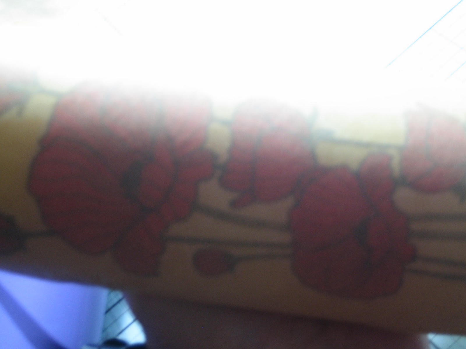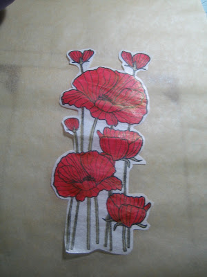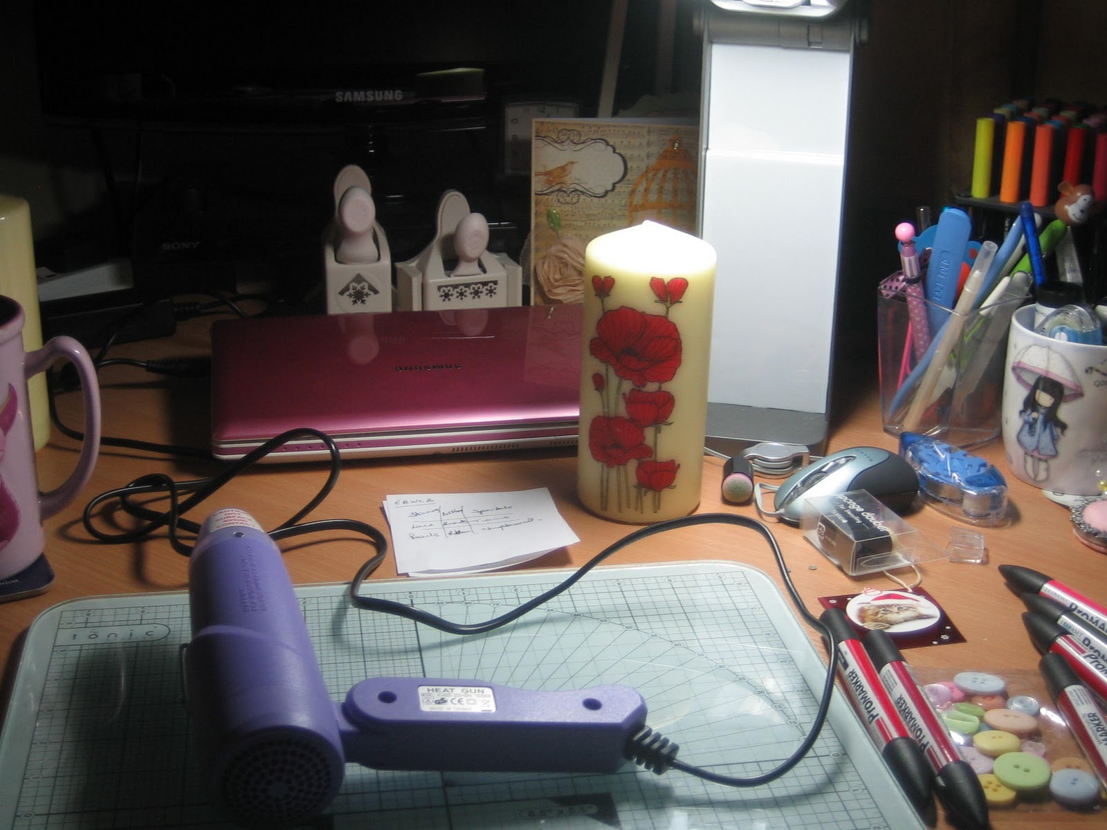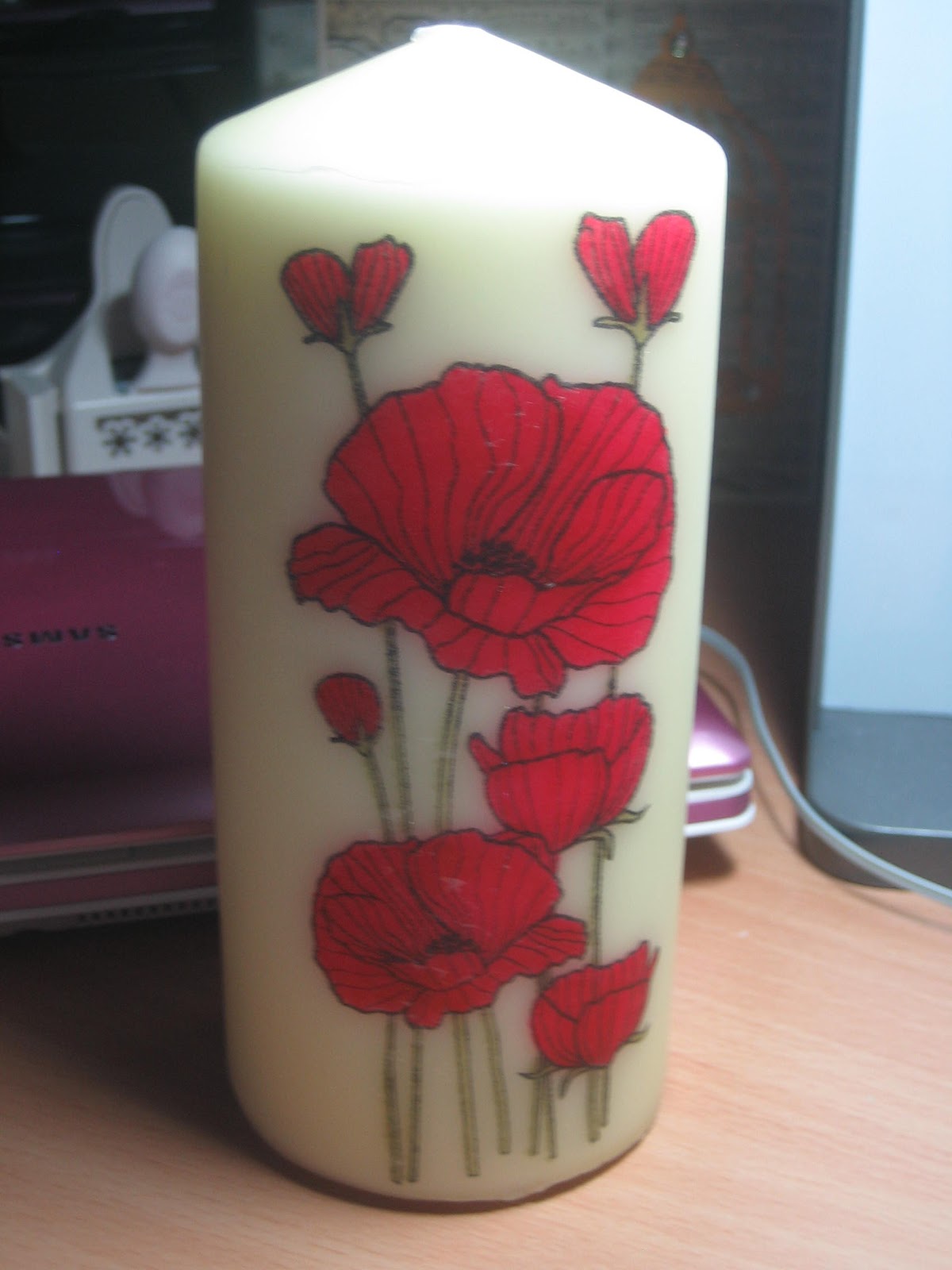 Thirdly, and I have no idea how you can work this one out at the point of purchase - I bought ivory coloured candles. My first go at the poppies candle almost left me in tears - right at the very end of the heating process, a chunk of ivory wax over half an inch square and about an eighth of an inch thick came away, leaving white wax showing. So, IF you can find plain white candles I'd go for those as it looks as if the ones I used had a final dipping into ivory wax just as a thick coating - the lovely WOYWW Julia knew about this 'fenominum' when we spoke last week. However, I got there in the end on the second attempt!