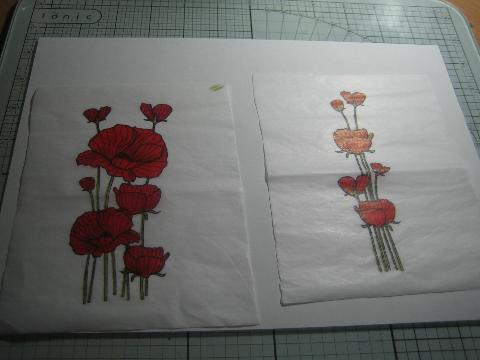 First of all I stamped a couple of Hero Arts 'Delicate Blossoms' images onto white tissue paper using a black Memento ink pad. Oh boy, finding white tissue paper in the shops was like looking for hen's teeth (sorry Sarn!) in the run-up to Christmas. Patterned and every colour under the sun galore but no plain white, although I did finally find some on my last pre-Christmas supermarket run. By then I felt too rough to do more than just dump the packet on my desk though :(