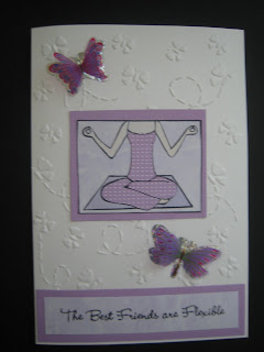 The white card was embossed using a Cuttlebug Butterflies folder, and the image was stamped onto white paper for the upper body and bare foot (then coloured with flesh pink watercolour pencil), lilac marbled effect paper for the background, plain lilac paper for the yoga mat, and patterned deeper lilac paper for the yoga outfit. All from my stash. After careful assembly, praying that I didn't lose bits as I made several in one go, the completed image was layered onto deep lilac Core'dinations card, as was the sentiment (also in the stamp set) after being stamped onto lilac marbled efect paper.