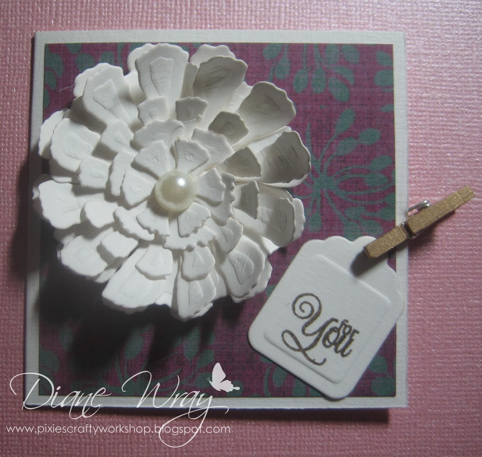 A sweet little gift box, topped with a carnation and a large pearl. I added my own row of pearls round the box itself.