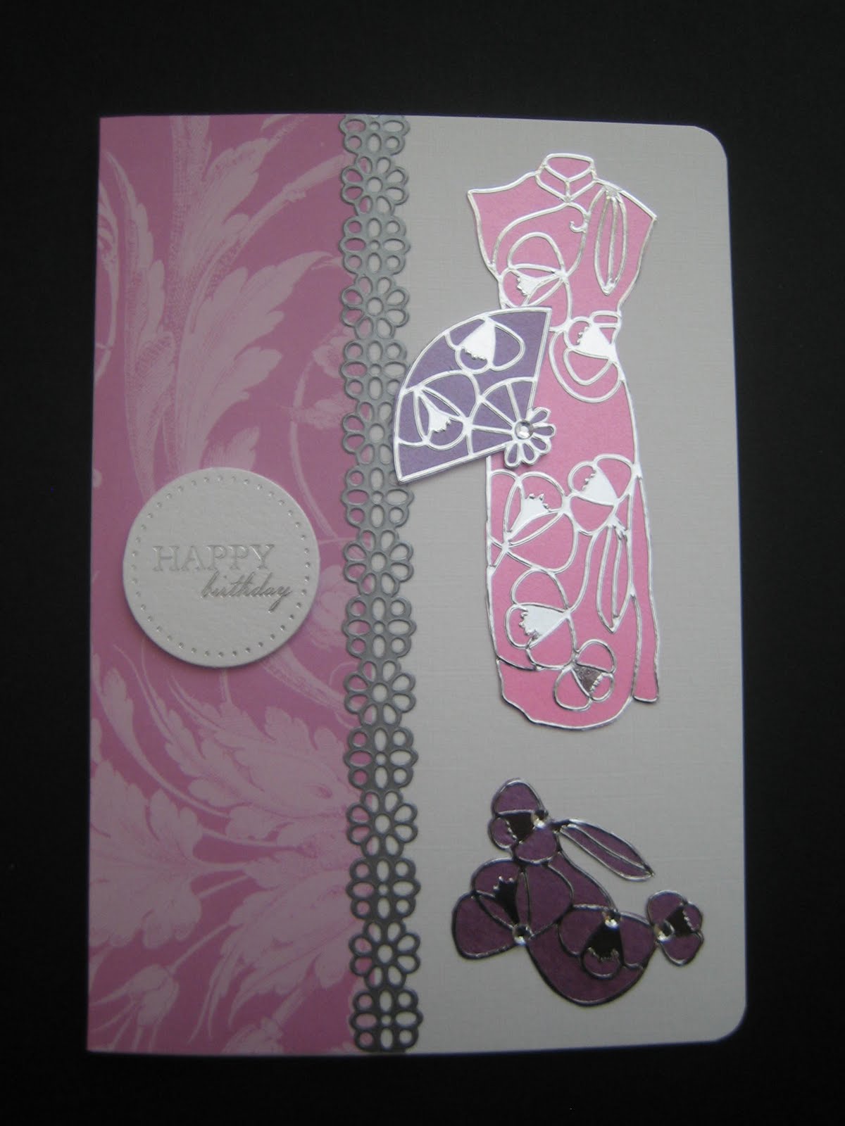 The dresses, fans and some embellies were made by sticking the peeloffs to pearlised paper from my stash and then trimming round the shapes. I've had the paper for ages and wish I could find the same pad again :( The paper down the left hand side of the card is from the Papermania Capsule Collection, silver self adhesive flowers strip from my stash (QVC), the sentiment is from Craftwork Cards and I just added a few clear diamantes (KanBan)to add a bit of 'bling'.