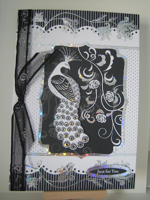 All I did was use an A4 sheet from the pack, score and fold it to A5 size, ponder over the multiple choices, stick using sticky pads (the peacock has an extra layer of the image for dimension), then add some organza ribbon from my stash. This ribbon, from Hobbycraft ages ago but I think they still stock it, is great as it has little silver sparkly swirls on it. For a long time I avoided ribbon like this as it comes wired but it's so simple to just cut your length and then pull the wire out from the end. It does widen the choices too :))