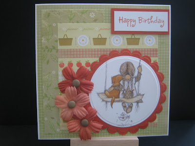 The backing papers are from a Picnic in the Park paper stack which came with a magazine recently, the sentiment is Elzybells, flowers and brads from my stash (I swear the ton of flowers I have must be breeding as they never seem to go down much) - and the rust coloured card is from a Core'dinations stack - which also never seems to go down! Ages ago I bought what was such a good investment - a load of DewDrop Brilliance ink pads. Whatever sentiment I might want to stamp - there's always one which will tone perfectly - this one is Pearlescent Rust. I think they came from QVC and I've already had my money's worth.