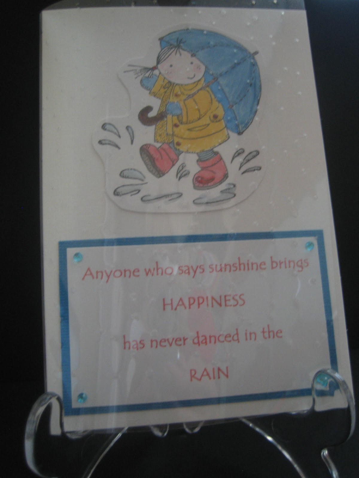 The image is a Sugar Nellie stamp called 'Splashing Maggie' and she's so cute :) Of course I coloured her with Aquamarkers, am loving those, and added some Anitas glaze to the puddle splashes and her coat buttons. I used plain white linen cardstock and then ran some acetate through the Cuttlebug using a random dots embossing folder which I think is really for snowy efffects but in real life it works very well giving the efect of rain when it's folded over the front of the card. The photo doesn't do it justice but I suspected that would be the case :(